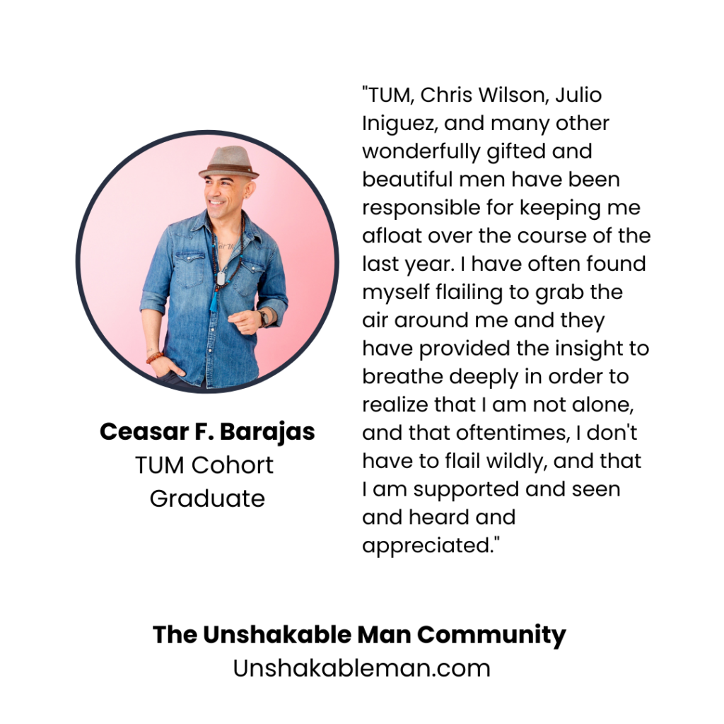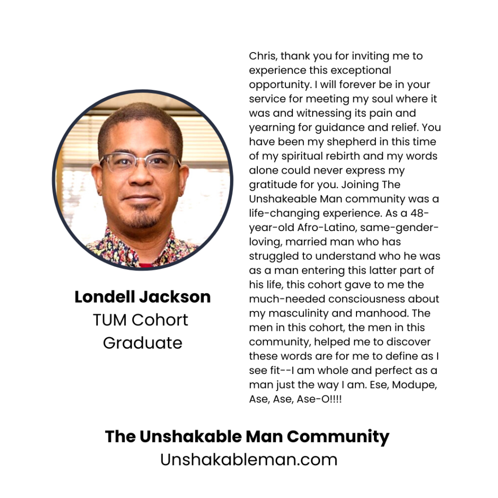 Chris, thank you for inviting me to experience this exceptional opportunity. I will forever be in your service for meeting my soul where it was and witnessing its pain and yearning for guidance and relief. You have been my shepherd in this time of my spiritual rebirth and my words alone could never express my gratitude for you. Joining The Unshakeable Man community was a life-changing experience. As a 48-year-old Afro-Latino, same-gender-loving, married man who has struggled to understand who he was as a man entering this latter part of his life, this cohort gave to me the much-needed consciousness about my masculinity and manhood. The men in this cohort, the men in this community, helped me to discover these words are for me to define as I see fit–I am whole and perfect as a man just the way I am. Ese, Modupe, Ase, Ase, Ase-O!!!!