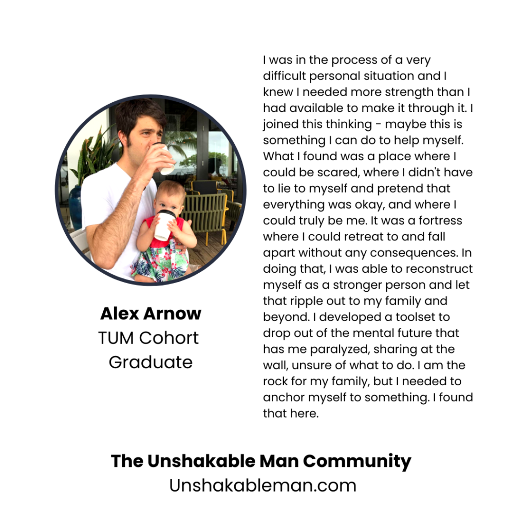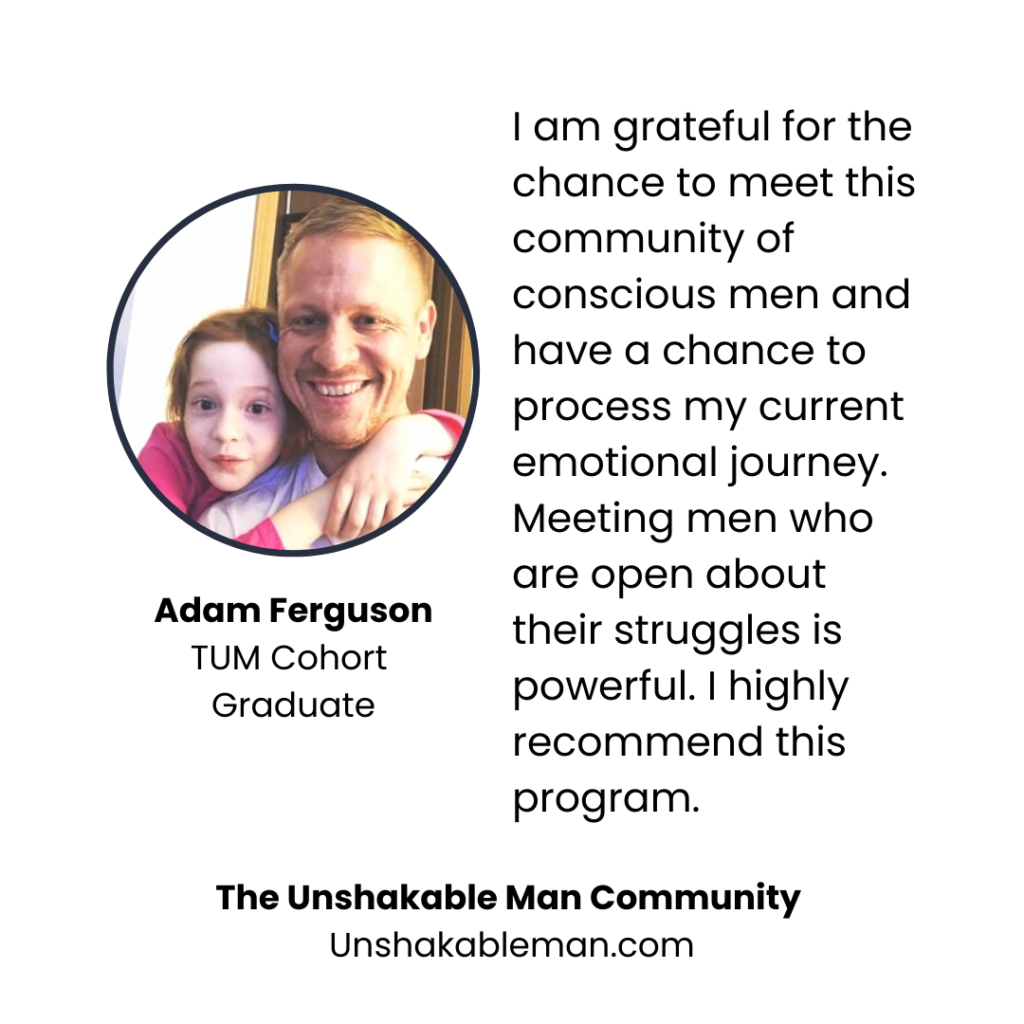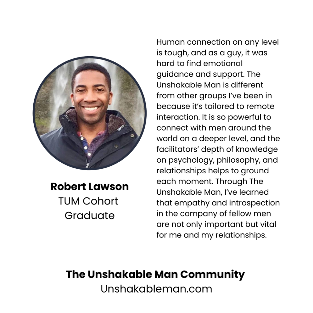 Human connection on any level is tough, and as a guy, it was hard to find emotional guidance and support. The Unshakable Man is different from other groups I’ve been in because it’s tailored to remote interaction. It is so powerful to connect with men around the world on a deeper level, and the facilitators’ depth of knowledge on psychology, philosophy, and relationships helps to ground each moment. Through The Unshakable Man, I’ve learned that empathy and introspection in the company of fellow men are not only important but vital for me and my relationships.