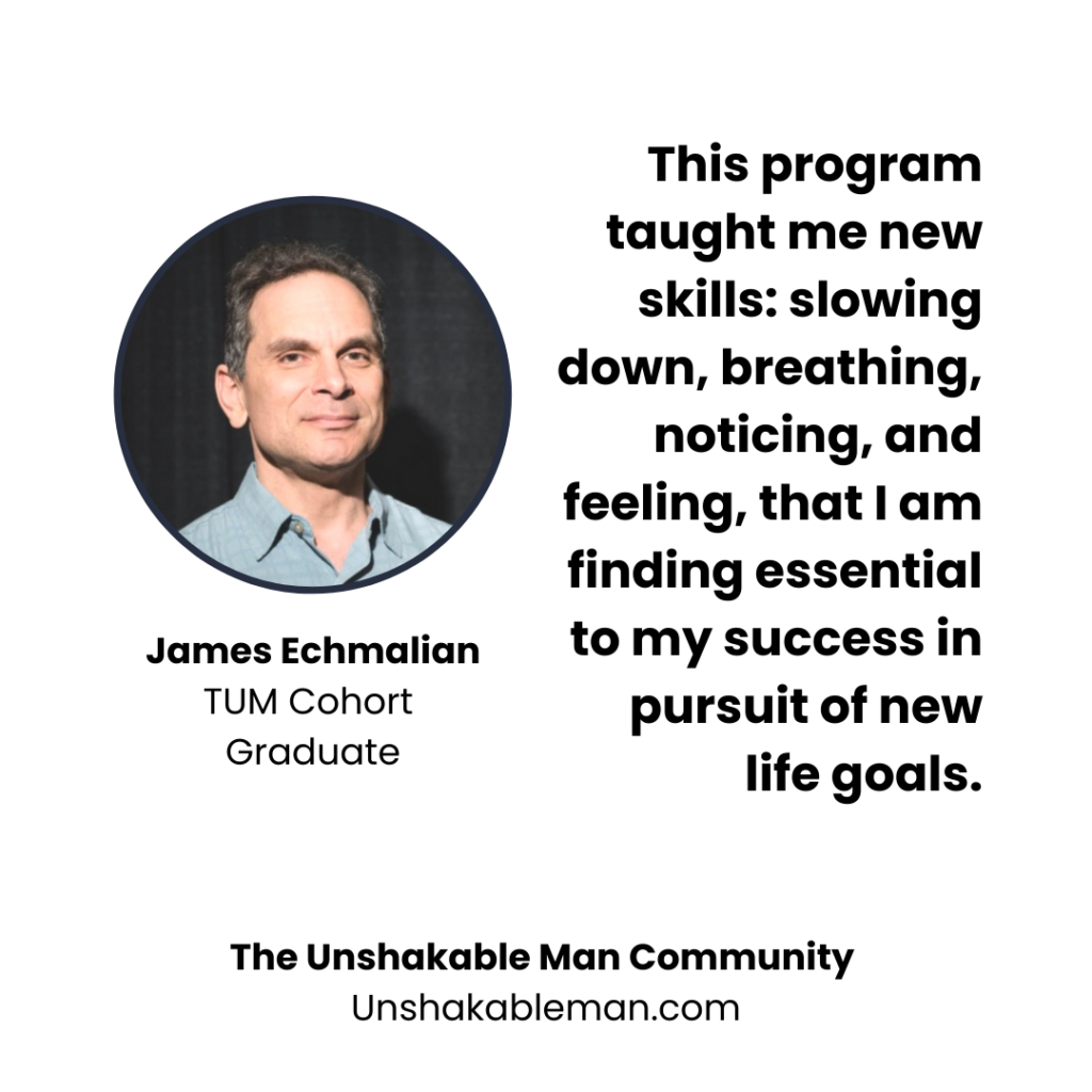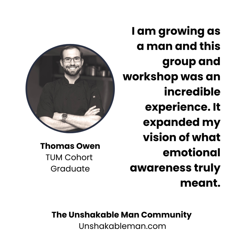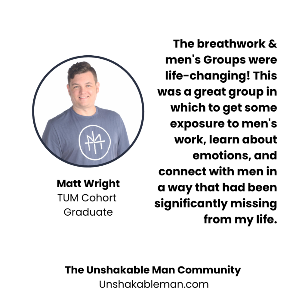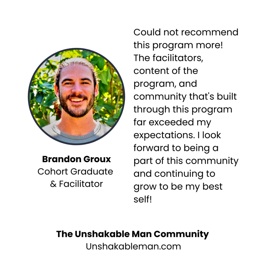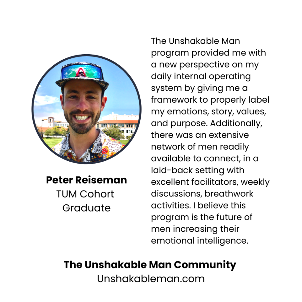 The Unshakable Man program provided me with a new perspective on my daily internal operating system by giving me a framework to properly label my emotions, story, values, and purpose. Additionally, there was an extensive network of men readily available to connect, in a laid-back setting with excellent facilitators, weekly discussions, breathwork activities. I believe this program is the future of men increasing their emotional intelligence.