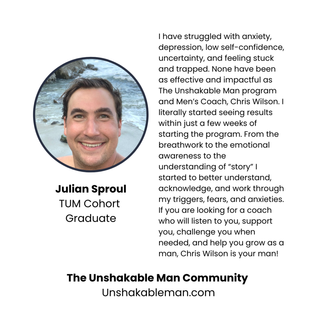 I have struggled with anxiety, depression, low self-confidence, uncertainty, and feeling stuck and trapped. None have been as effective and impactful as The Unshakable Man program and Men’s Coach, Chris Wilson. I literally started seeing results within just a few weeks of starting the program. From the breathwork to the emotional awareness to the understanding of “story” I started to better understand, acknowledge, and work through my triggers, fears, and anxieties. If you are looking for a coach who will listen to you, support you, challenge you when needed, and help you grow as a man, Chris Wilson is your man!