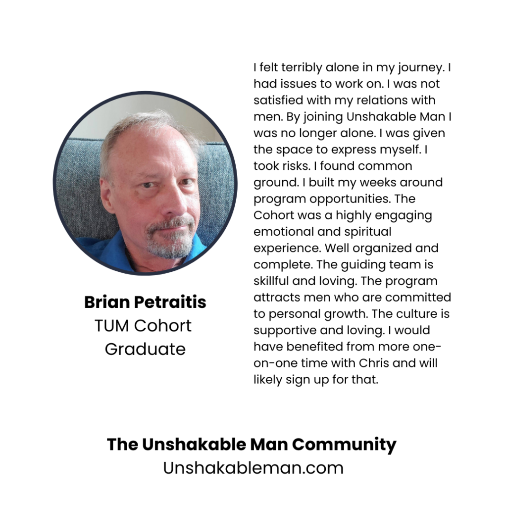 I felt terribly alone in my journey. I had issues to work on. I was not satisfied with my relations with men. By joining Unshakable Man I was no longer alone. I was given the space to express myself. I took risks. I found common ground. I built my weeks around program opportunities. The Cohort was a highly engaging emotional and spiritual experience. Well organized and complete. The guiding team is skillful and loving. The program attracts men who are committed to personal growth. The culture is supportive and loving. I would have benefited from more one-on-one time with Chris and will likely sign up for that.