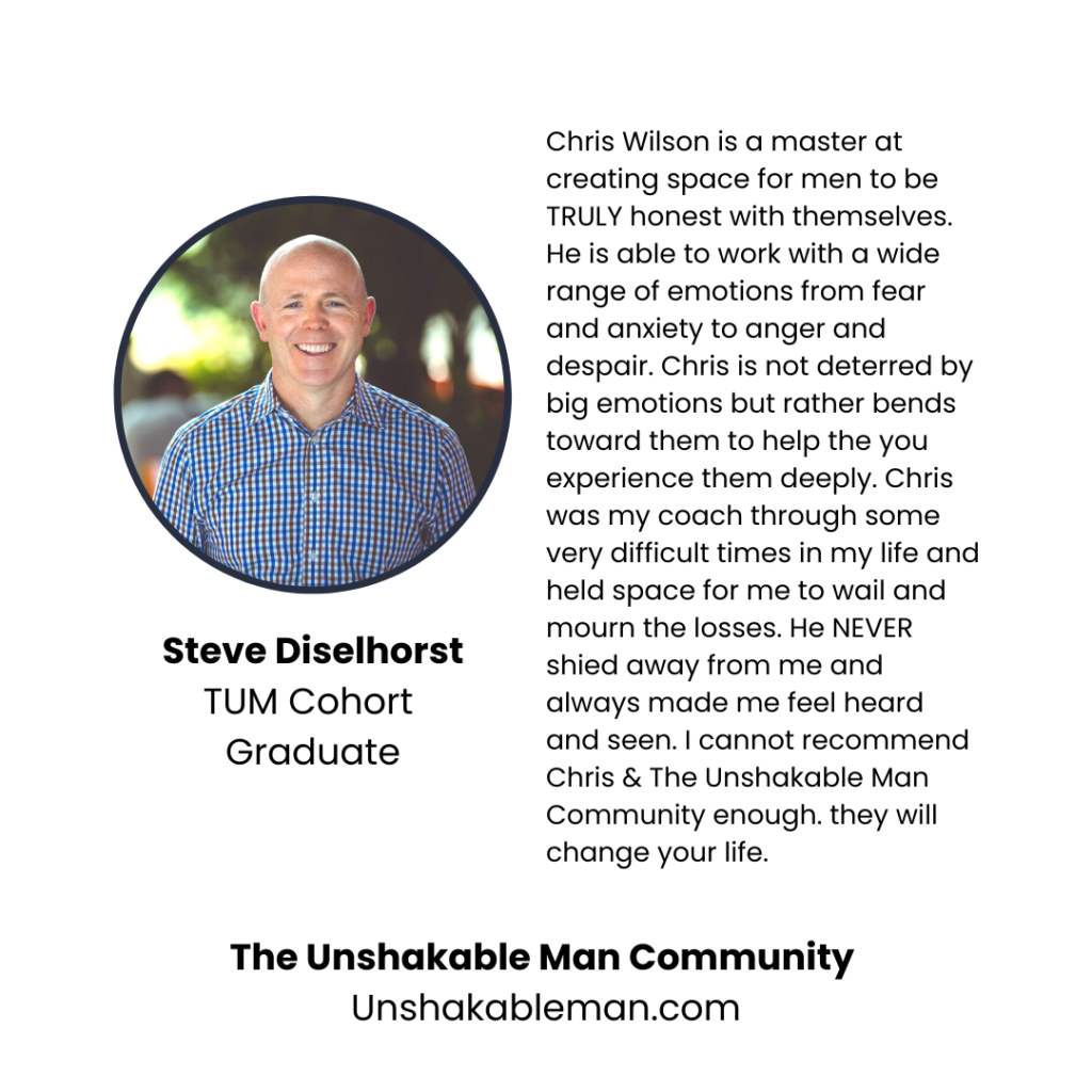 Chris Wilson is a master at creating space for men to be TRULY honest with themselves. He is able to work with a wide range of emotions from fear and anxiety to anger and despair. Chris is not deterred by big emotions but rather bends toward them to help the you experience them deeply. Chris was my coach through some very difficult times in my life and held space for me to wail and mourn the losses. He NEVER shied away from me and always made me feel heard and seen. I cannot recommend Chris & The Unshakable Man Community enough. they will change your life.