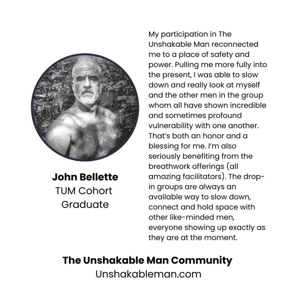 My participation in The Unshakable Man reconnected me to a place of safety and power. Pulling me more fully into the present, I was able to slow down and really look at myself and the other men in the group whom all have shown incredible and sometimes profound vulnerability with one another. That’s both an honor and a blessing for me. I’m also seriously benefiting from the breathwork offerings (all amazing facilitators). The drop-in groups are always an available way to slow down, connect and hold space with other like-minded men, everyone showing up exactly as they are at the moment.