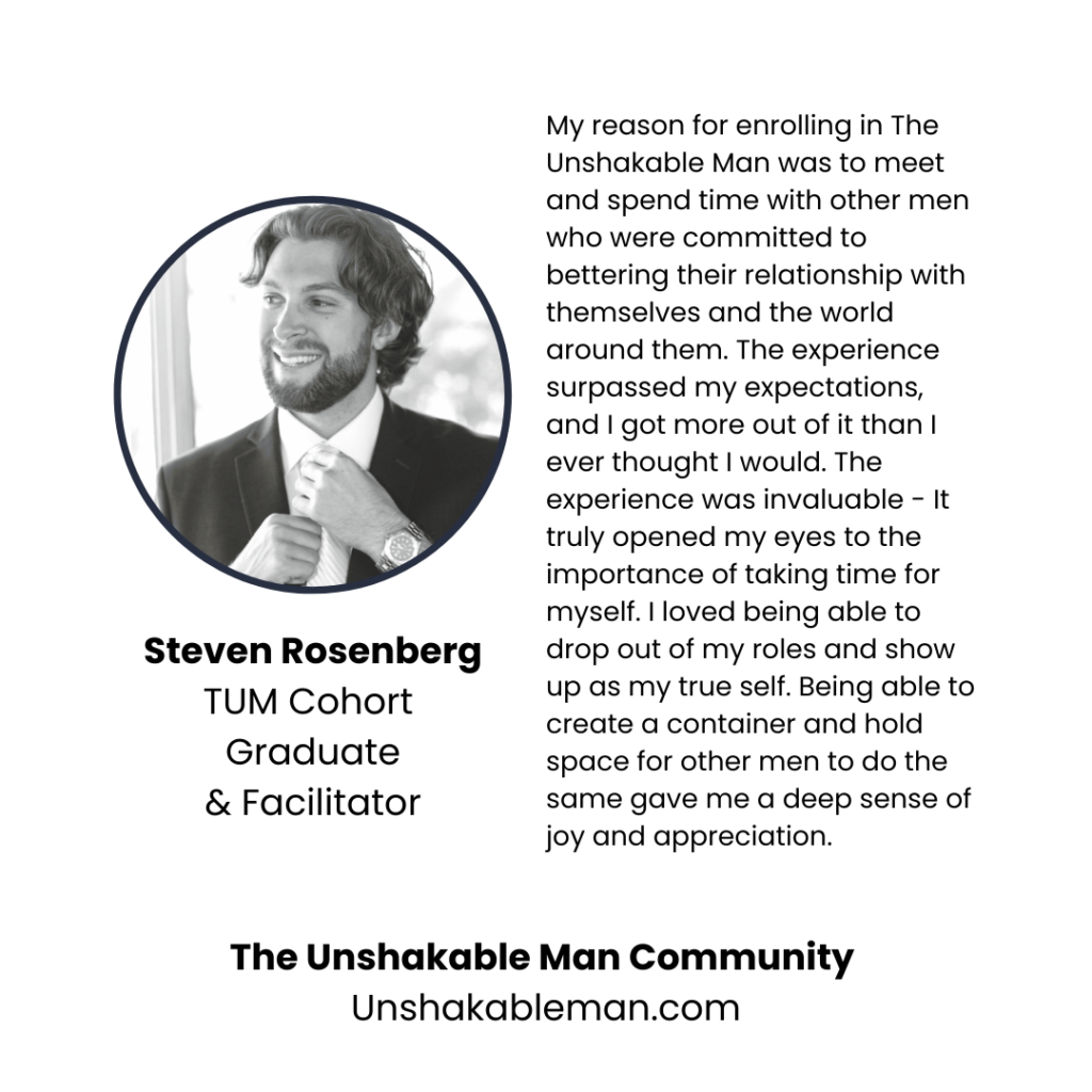 My reason for enrolling in The Unshakable Man was to meet and spend time with other men who were committed to bettering their relationship with themselves and the world around them. The experience surpassed my expectations, and I got more out of it than I ever thought I would. The experience was invaluable – It truly opened my eyes to the importance of taking time for myself. I loved being able to drop out of my roles and show up as my true self. Being able to create a container and hold space for other men to do the same gave me a deep sense of joy and appreciation.
